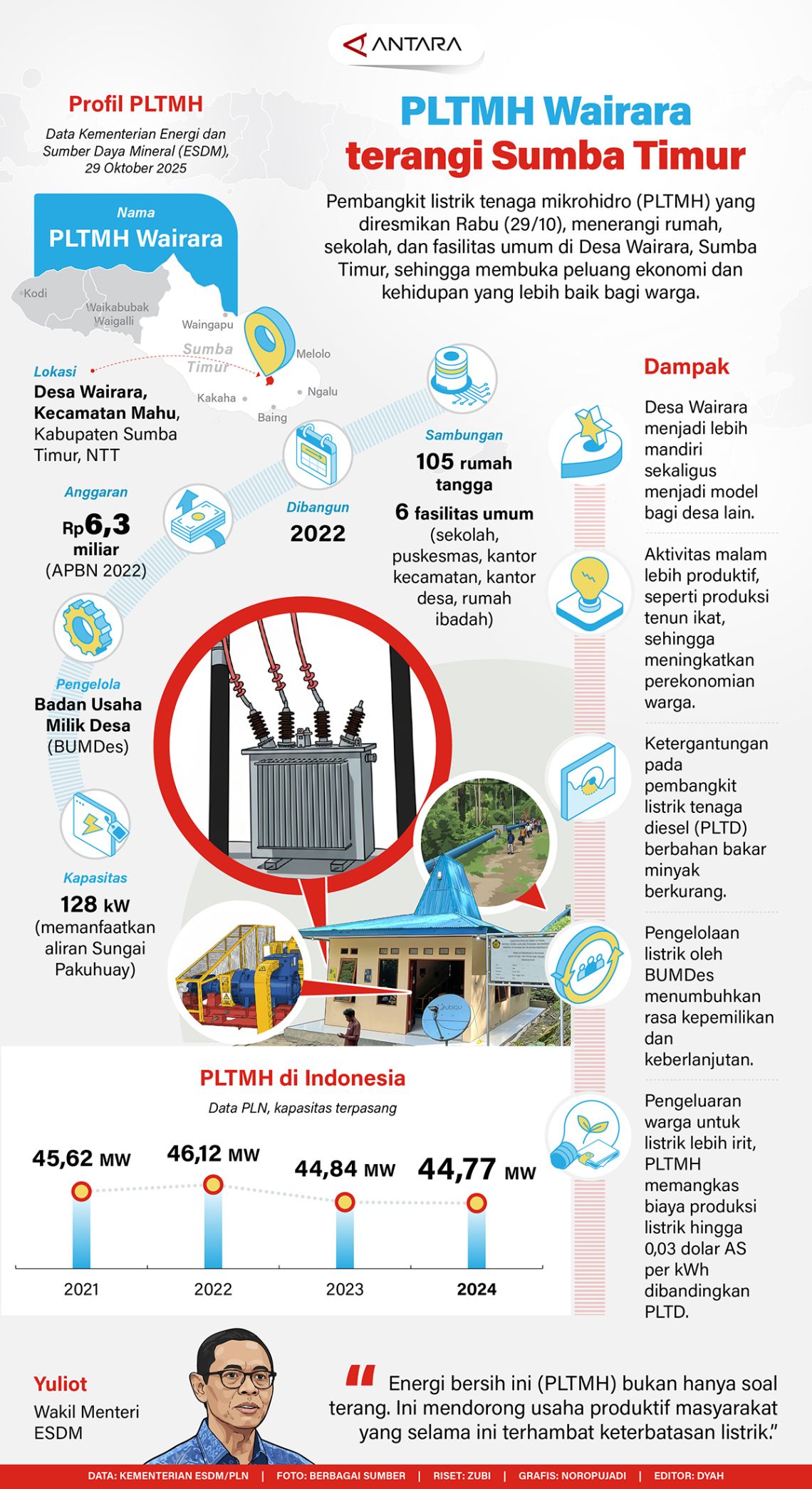 Pembangkit listrik tenaga mikrohidro (PLTMH) yang diresmikan Rabu (29/10), menerangi rumah, sekolah, dan fasilitas umum di Desa Wairara, Sumba Timur, sehingga membuka peluang ekonomi dan kehidupan yang lebih baik bagi warga.