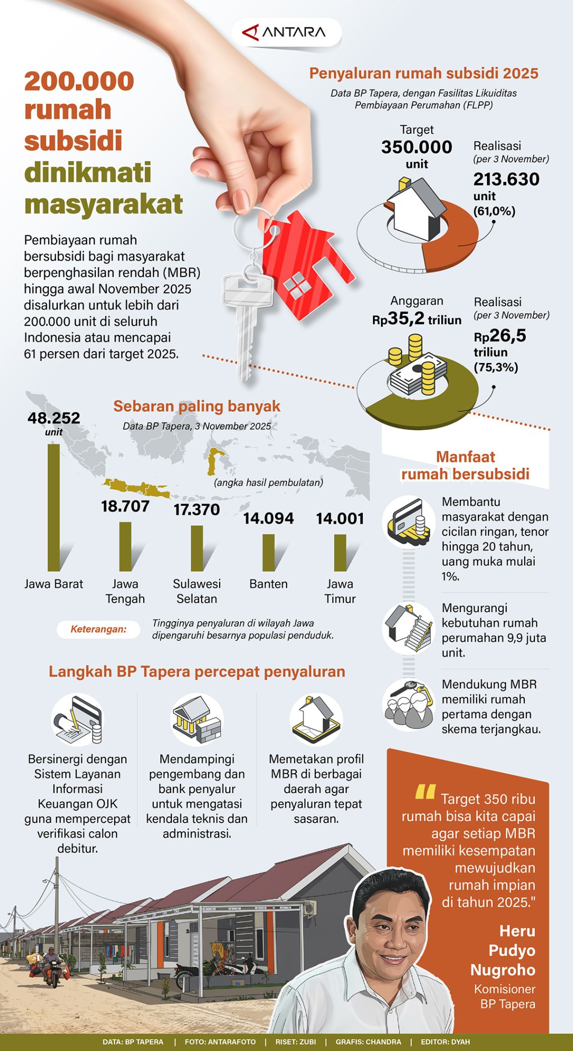 Pembiayaan rumah bersubsidi bagi masyarakat berpenghasilan rendah (MBR) hingga awal November 2025 disalurkan untuk lebih dari 200.000 unit di seluruh Indonesia atau mencapai 61 persen dari target 2025.