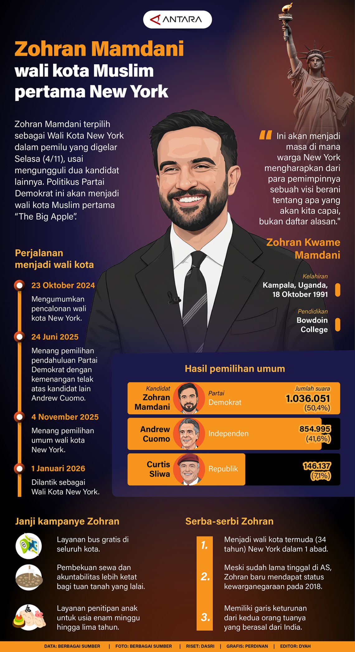 Zohran Mamdani terpilih sebagai Wali Kota New York dalam pemilu yang digelar Selasa (4/11), usai mengungguli dua kandidat lainnya. Politikus Partai Demokrat ini akan menjadi wali kota Muslim pertama “The Big Apple”.