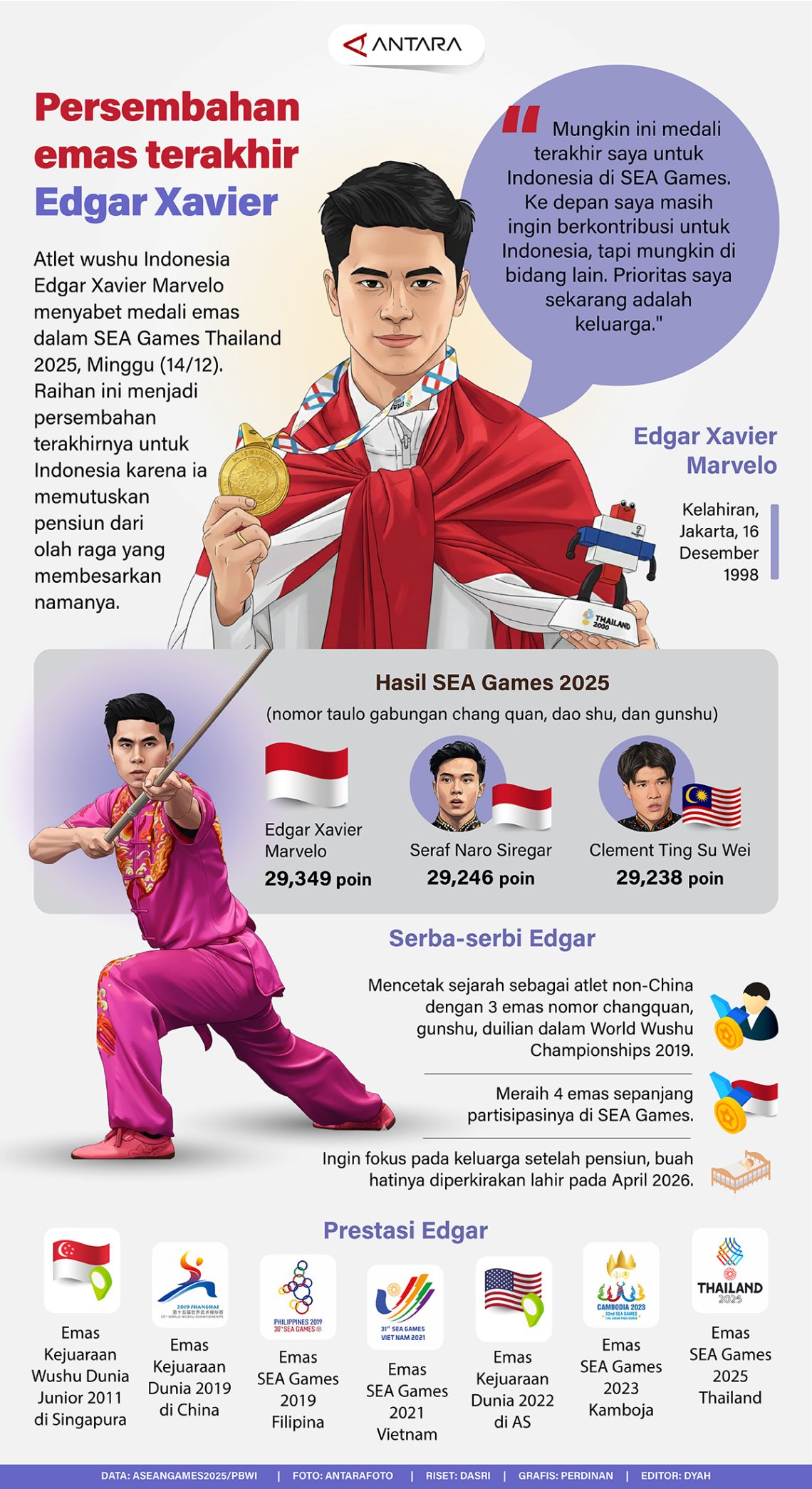 Atlet wushu Indonesia Edgar Xavier Marvelo menyabet medali emas dalam SEA Games Thailand 2025, Minggu (14/12). Raihan ini menjadi persembahan terakhirnya untuk Indonesia karena ia memutuskan pensiun dari olah raga yang membesarkan namanya.