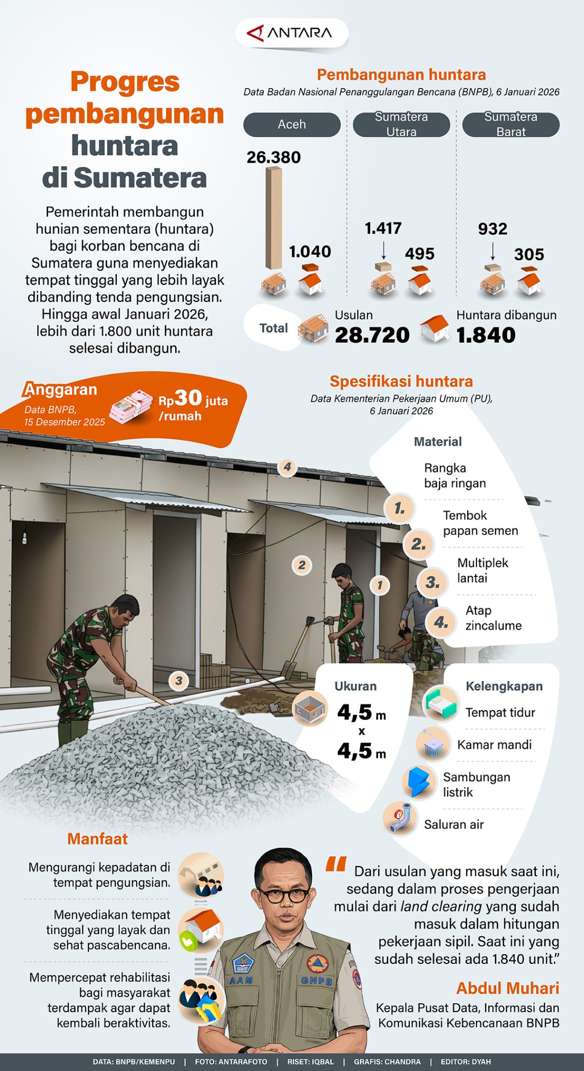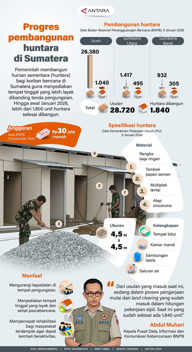Pemerintah membangun hunian sementara (huntara) bagi korban bencana di Sumatera guna menyediakan tempat tinggal yang lebih layak dibanding tenda pengungsian. Hingga awal Januari 2026, lebih dari 1.800 unit huntara selesai dibangun.