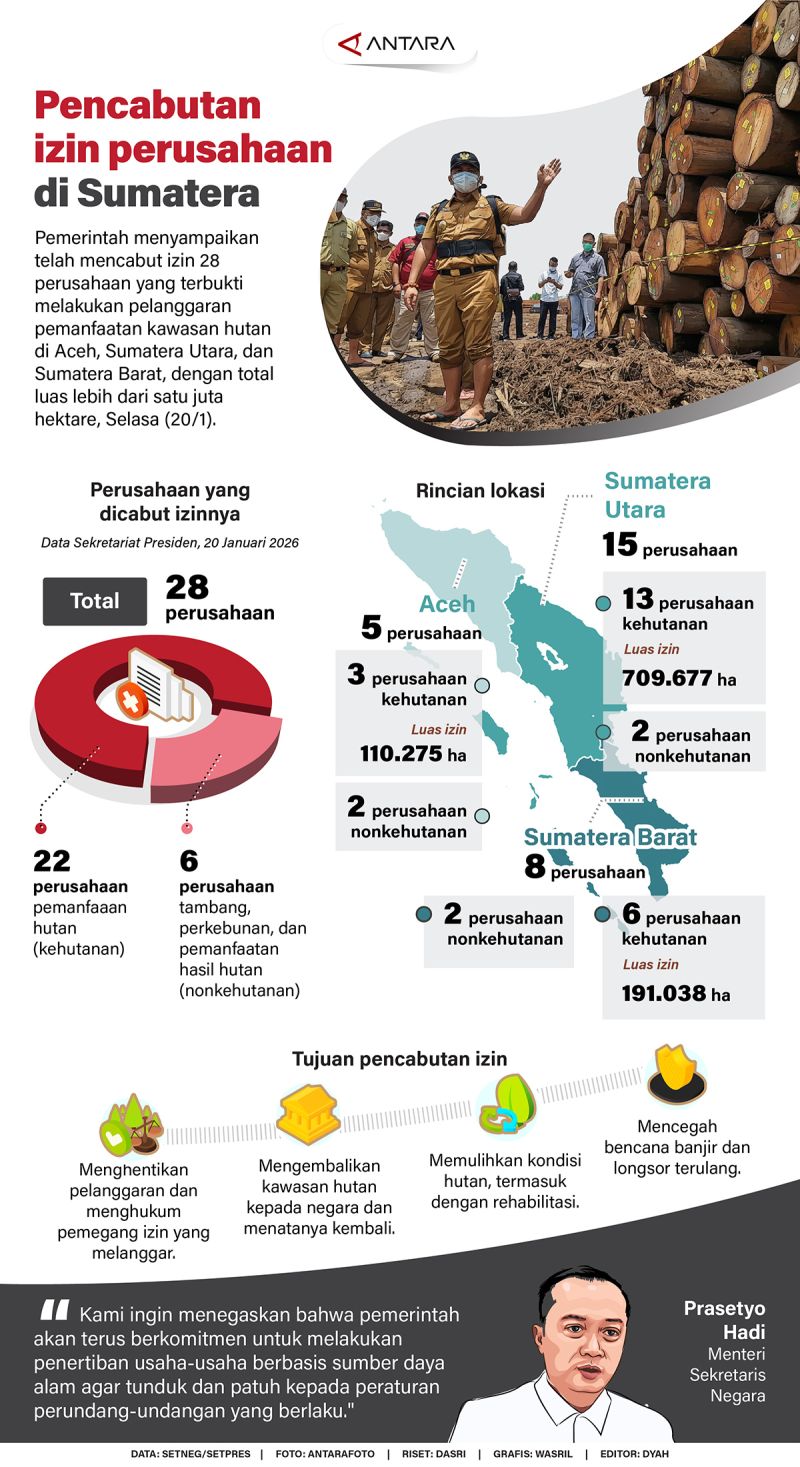 Pemerintah menyampaikan telah mencabut izin 28 perusahaan yang terbukti melakukan pelanggaran pemanfaatan kawasan hutan di Aceh, Sumatera Utara, dan Sumatera Barat, dengan total luas lebih dari satu juta hektare, Selasa (20/1).