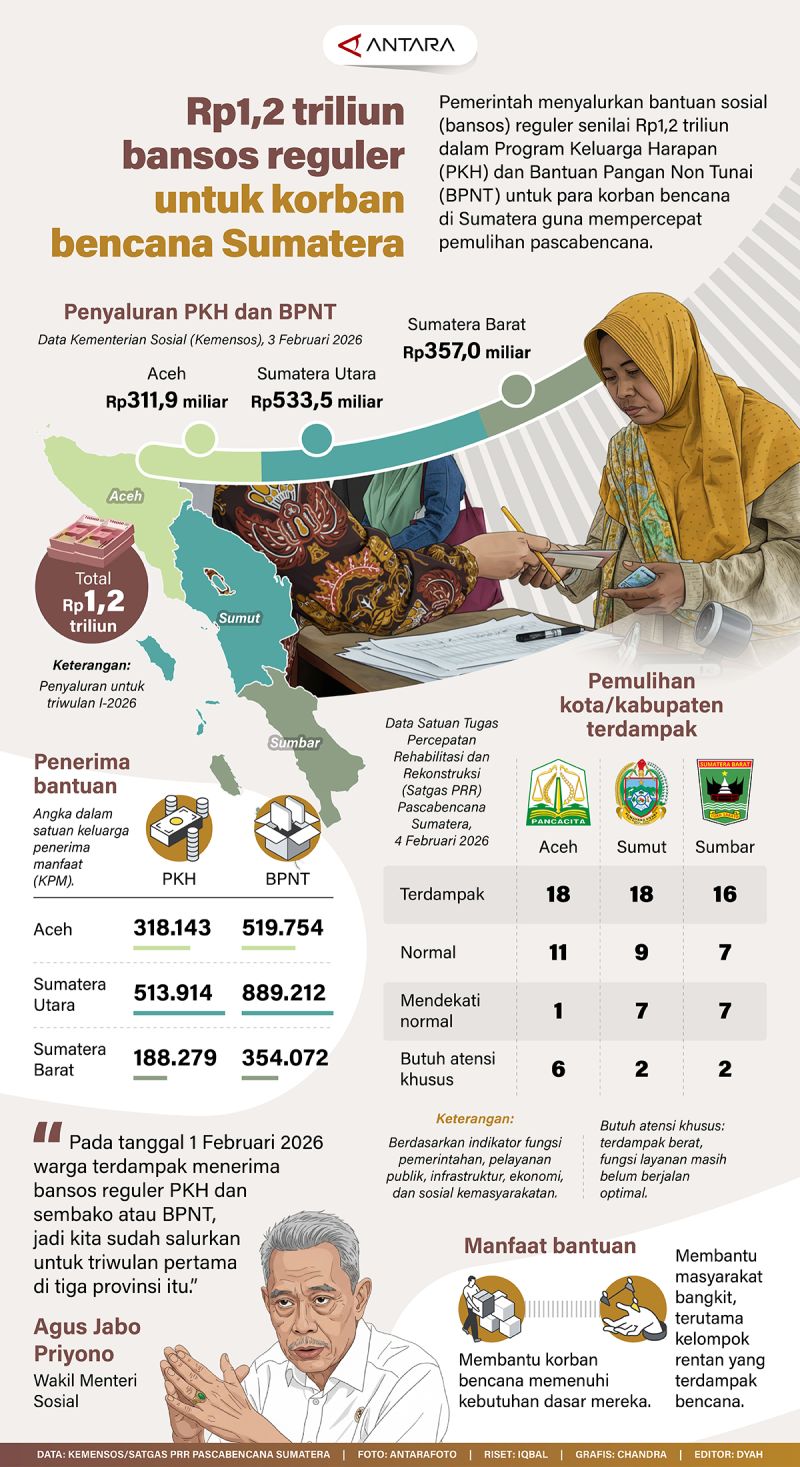 Pemerintah menyalurkan bantuan sosial (bansos) reguler senilai Rp1,2 triliun dalam Program Keluarga Harapan (PKH) dan Bantuan Pangan Non Tunai (BPNT) untuk para korban bencana di Sumatera guna mempercepat pemulihan pascabencana.