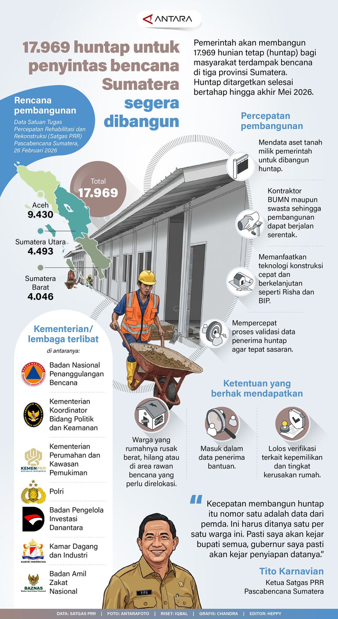 Pemerintah akan membangun 17.969 hunian tetap (huntap) bagi masyarakat terdampak bencana di tiga provinsi Sumatera. Huntap ditargetkan selesai bertahap hingga akhir Mei 2026.