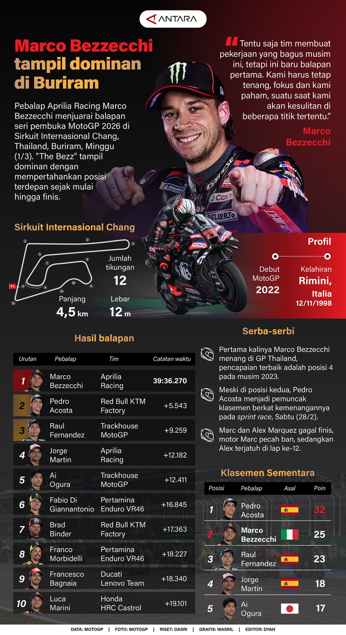Pebalap Aprilia Racing Marco Bezzecchi menjuarai balapan seri pembuka MotoGP 2026 di Sirkuit Internasional Chang, Buriram, Thailand, Minggu (1/3). "The Bezz" tampil dominan dengan mempertahankan posisi terdepan sejak mulai hingga finis.