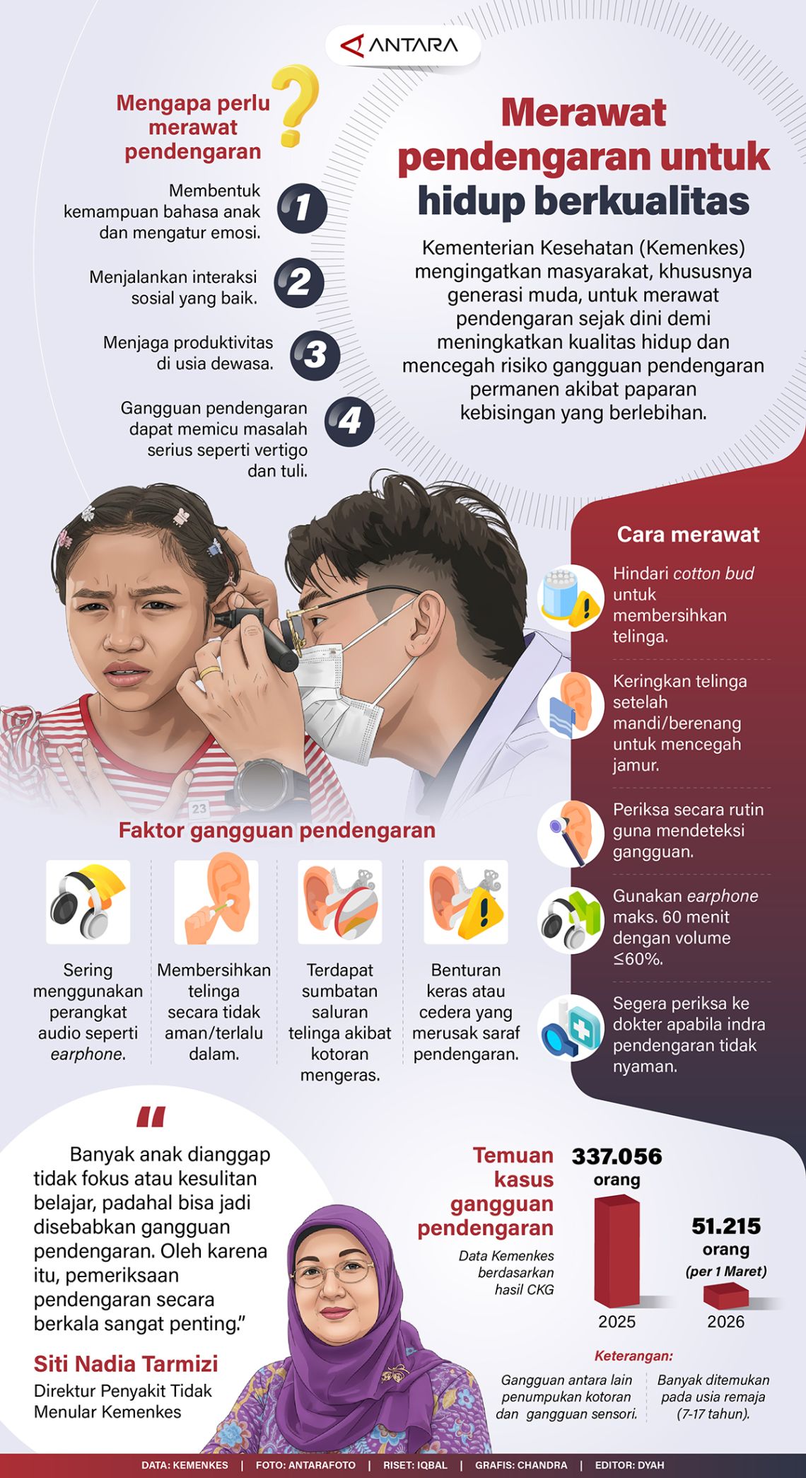 Kementerian Kesehatan (Kemenkes) mengingatkan masyarakat, khususnya generasi muda, untuk merawat pendengaran sejak dini demi meningkatkan kualitas hidup dan mencegah risiko gangguan pendengaran permanen akibat paparan kebisingan yang berlebihan.