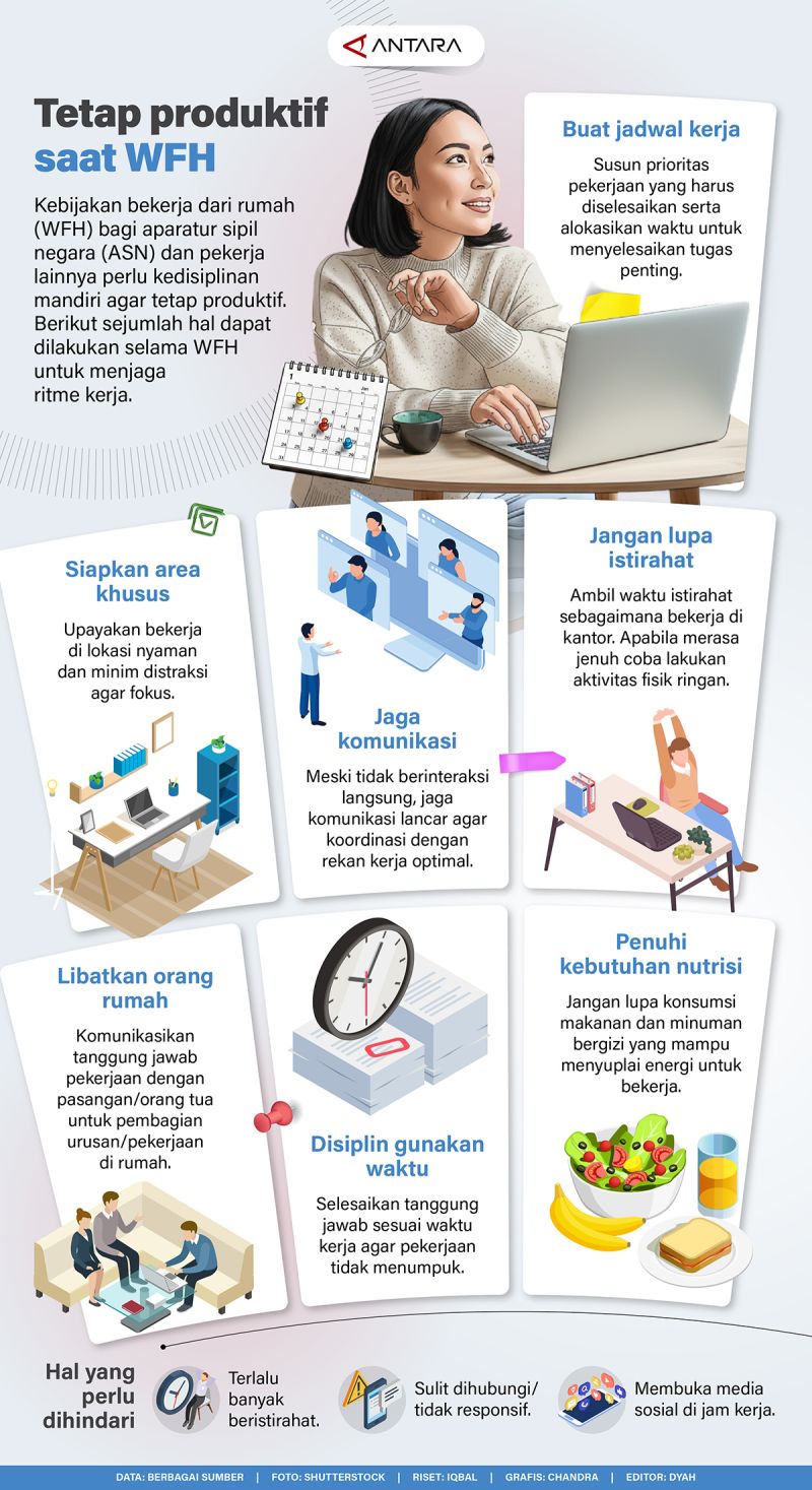 Kebijakan bekerja dari rumah (WFH) bagi aparatur sipil negara (ASN) dan pekerja lainnya menempatkan kedisiplinan mandiri sebagai fondasi utama agar tetap produktif. Berikut sejumlah hal dapat dilakukan selama WFH untuk menjaga ritme kerja.