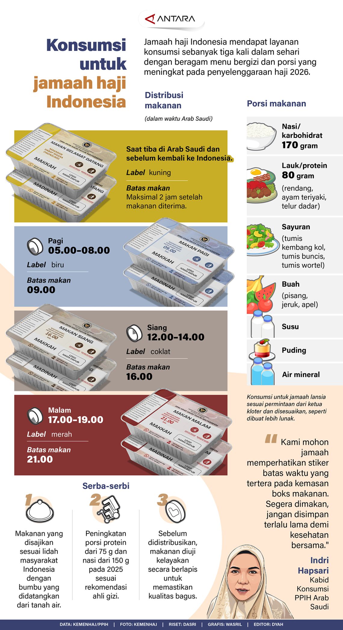 Jamaah haji Indonesia mendapat layanan konsumsi sebanyak tiga kali dalam sehari dengan beragam menu bergizi dan porsi yang meningkat pada penyelenggaraan haji 2026.