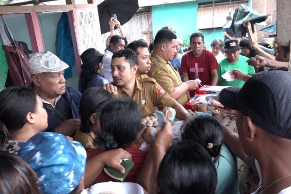 ANTARA - Pemerintah kota (Pemkot) Ambon melaksanakan gerakan pangan murah di desa Hutumuri, kecamatan Leitimur Selatan, kota Ambon, Selasa (5/8). Gerakan pangan murah tersebut dilakukan untuk menekan laju inflasi dan menjaga daya beli masyarakat, di tengah cuaca ekstrem yang berdampak pada distribusi harga bahan pokok.(Alfian Sanusi/Yovita Amalia/Ludmila Yusufin Diah Nastiti)