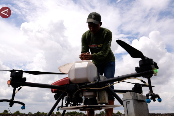 ANTARA - Kabupaten Tanah Laut, Kalimantan Selatan, mengawali tanam padi perdana di lahan Cetak Sawah Rakyat (CSR) seluas 359 hektare di Desa Ujung, Kecamatan Bati-Bati, Selasa (12/8). Penanaman dilakukan menggunakan teknologi drone untuk mempermudah proses sebar benih. (Irfansyah Naufal Nasution/Syahrudin/Satrio Giri Marwanto/Roy Rosa Bachtiar)