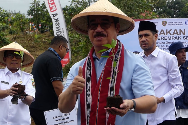 ANTARA - Gubernur Maluku Hendrik Lewerissa memimpin penanaman 100 ribu anakan cabai secara serempak di seluruh Kabupaten/Kota yang digelar di dusun Talaga Kodok, Kecamatan Leihitu Kabupaten Maluku Tengah, Maluku, Rabu (13/8). Penanaman tersebut sebagai upaya menjaga dan memperkuat ketahanan pangan serta menekan laju inflasi di Maluku.(Alfian Sanusi/Chairul Fajri/Ludmila Yusufin Diah Nastiti)