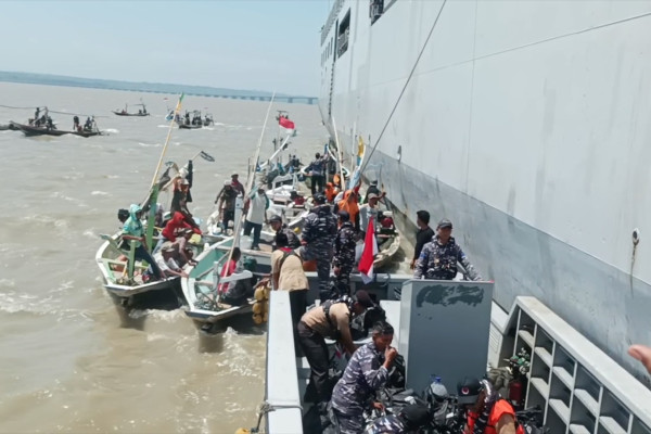 ANTARA - Kwartir Daerah Gerakan Pramuka Jawa Timur bersama segenap pejabat forum koordinasi pimpinan daerah (forkopimda) provinsi setempat membagikan sembako kepada para nelayan di Selat Madura. Kegiatan ini merupakan bagian dari rangkaian acara peringatan Hari Pramuka ke- 64. (Hanif Nasrullah/Andi Bagasela/Gracia Simanjuntak)