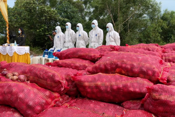 ANTARA - Badan Karantina Indonesia (Barantin) melalui Unit Pelaksana Teknis (UPT) Balai Karantina Hewan, Ikan, dan Tumbuhan Provinsi Kepulauan Riau memusnahkan 4 ton bawang merah besar atau bawang bombai yang terkontaminasi bakteri. Deputi Bidang Karantina Tumbuhan Barantin Bambang di Batam, Jumat (15/8), mengatakan bahwa sekitar 400 karung bawang itu juga tidak dilengkapi dengan dokumen resmi. (Angiela Chantiequ/Chairul Fajri/Gracia Simanjuntak)