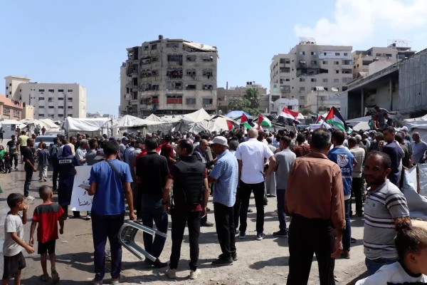 ANTARA - Ratusan warga Palestina berkumpul di depan Pusat Kebudayaan Rashad Shawa, Kota Gaza, untuk sebuah demonstrasi bertajuk "Gerakan Jam Terakhir". Penyelenggara mengatakan demonstrasi tersebut menyoroti penderitaan warga Jalur Gaza yang telah menanggung perang selama hampir dua tahun. (XINHUA/Gracia Simanjuntak/Soni Namura/Roy Rosa Bachtiar)
