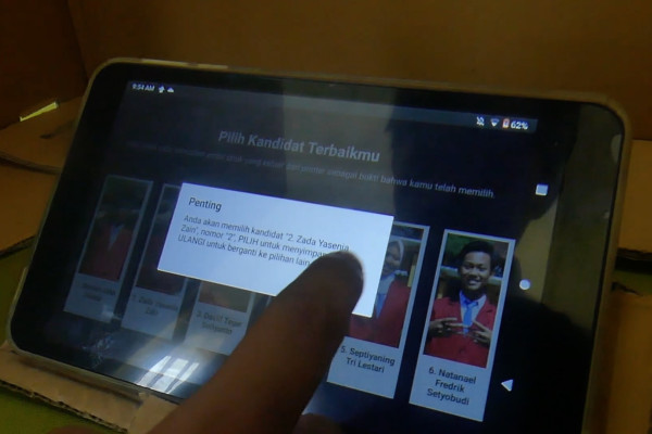 ANTARA - Komisi Pemilihan Umum (KPU) Kabupaten Temanggung, Jawa Tengah memfasilitasi Pemilihan Ketua OSIS di SMA Negeri 2 dengan menerapkan pemungutan suara secara elektronik atau E-Voting, Senin (25/8). Pemanfaatan teknologi digital ini menjadi upaya KPU dalam menciptakan pemilih yang cerdas, rasional dan bertanggung jawab.(Firman Eko Handy/Yovita Amalia/Ludmila Yusufin Diah Nastiti)