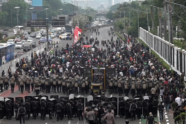 ANTARA - Aksi unjuk rasa sejumlah aliansi masyarakat di depan gedung DPR RI pada Senin (25/8) siang mulai kondusif. Massa yang memadati dipukul mundur oleh sekitar 1.200 personel kepolisian menjauhi kompleks parlemen Senayan. (Azhfar Muhammad Robbani/Ryan Rahman/Arif Prada/Gracia Simanjuntak)