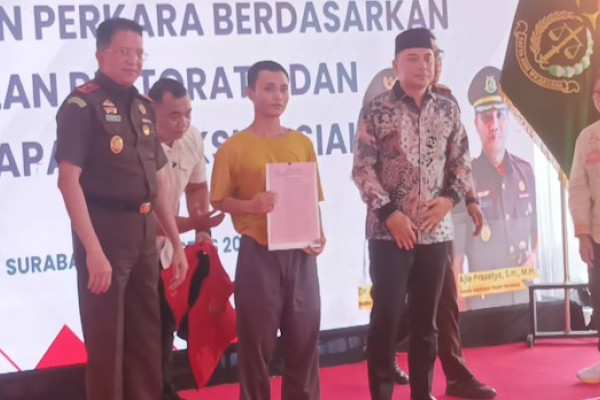 ANTARA - Penyelesaian perkara berdasarkan keadilan restoratif di Kejaksaan Negeri (Kejari) Surabaya, kini disertai dengan penerapan sanksi sosial. Sebanyak 11 pelaku tindak pidana telah diserahterimakan kepada Pemerintah Kota Surabaya untuk menjalani sanksi sosial di Lingkungan Pondok Sosial setempat. (Hanif Nasrullah/Rizky Bagus Dhermawan/Rinto A Navis)