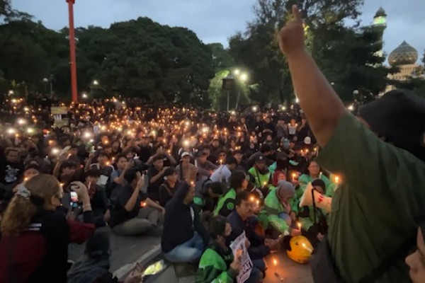 ANTARA - Ribuan warga Malang, Jawa Timur, menggelar aksi solidaritas dan doa bersama di Alun-alun Merdeka, Jumat (29/8), sebagai ekspresi kedukaan atas meninggalnya Affan Kurniawan, pengemudi ojek online (ojol) di Jakarta. Dengan berpakaian serba hitam, mereka menyuarakan sejumlah tuntutan, termasuk proses hukum yang transparan dan akuntabel bagi oknum aparat yang melindas korban. (Achmad Saif Hajarani/Rizky Bagus Dhermawan/Gracia Simanjuntak)