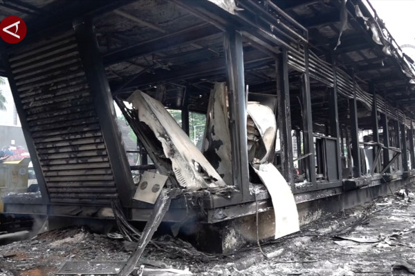 ANTARA - Situasi terkini sejumlah fasilitas umum Halte Transjakarta, Halte MRT Jakarta, dan Gerbang Tol Senayan yang terbakar, pasca demonstrasi yang terjadi, pada Jumat (29/8). Arus lalu lintas pun kembali kondusif dan bisa dilalui pengendara. (Irfan Hardiansyah/Syamsul Rizal/Satrio Giri Marwanto/Hilary Pasulu)