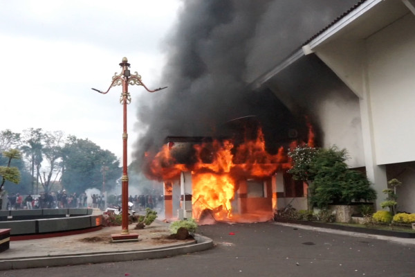 ANTARA - Aksi demo di kompleks Setda dan DPRD Kota Pekalongan, Jawa Tengah, berujung ricuh hingga bertransformasi menjadi amuk massa. Dandim 0710 Pekalongan, Letkol Arm Ihalauw Garry Herlambang pada Sabtu 30 Agustus 2025 mengatakan, sejumlah bangunan dan kendaraan terbakar, sementara polisi yang menjadi sasaran utama terpaksa ditarik mundur. Upaya pemadaman api dilakukan oleh anggota TNI menggunakan alat seadanya setelah mobil pemadam kebakaran dihalangi massa. (Yusup Fatoni/Arif Prada/Roy Rosa Bachtiar)