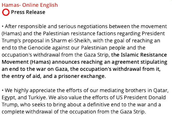 ANTARA - Hamas mengonfirmasi telah mencapai kesepakatan untuk mengakhiri perang, mencakup penarikan pasukan Israel dan pertukaran sandera-tahanan. Namun, kelompok tersebut meminta Trump dan negara-negara penjamin untuk memastikan Israel sepenuhnya menerapkan gencatan senjata. (REUTERS/Ludmila Yusufin Diah Nastiti/Rizky Bagus Dhermawan/Rijalul Vikry)
