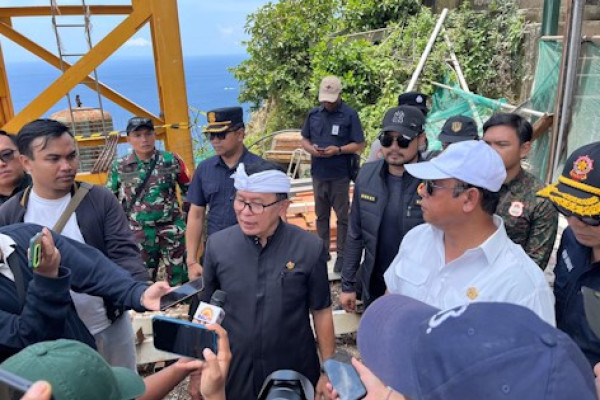 ANTARA - Panitia Khusus Tata Ruang, Aset, dan Perizinan (Pansus TRAP) DPRD Bali menutup sementara pembangunan elevator kaca di tebing Pantai Kelingking, Nusa Penida, Kabupaten Klungkung, Jumat (31/10). Pembangunan dihentikan hingga pemilik melengkapi perizinan yang diperlukan. (Rita Laura/Ni Putu Putri Muliantari/Rizky Bagus Dhermawan/Nanien Yuniar)