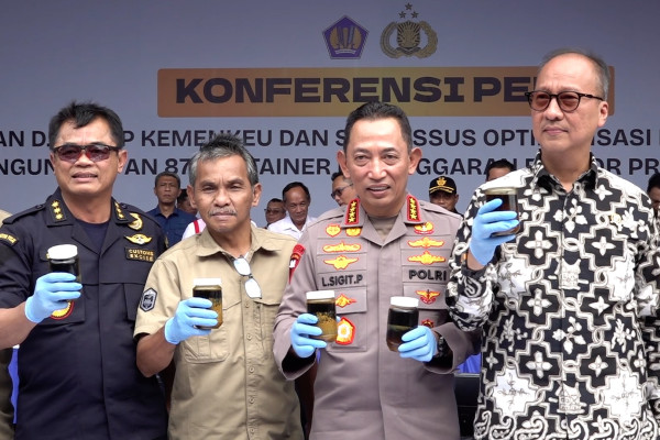 ANTARA - Direktorat Jenderal Bea dan Cukai, Kementerian Keuangan bersama Polri berhasil menggagalkan ekspor ilegal produk turunan crude palm oil (CPO) sebanyak 1.802 ton senilai Rp28,7 miliar. Dirjen Bea dan Cukai, Djaka Budi Utama dalam konferensi pers di pelabuhan Tanjung Priok, Jakarta, Kamis (6/11), menjelaskan pada 20-25 Oktober 2025 pihaknya mencegah ekspor ilegal produk berupa fatty matter yang akan dikirim dalam 87 kontainer milik PT. MMS. (Irfan Hardiansyah/Chairul Fajri/Rijalul Vikry)