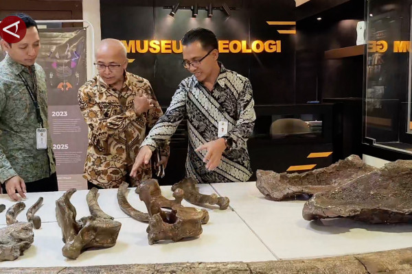 ANTARA - Badan Geologi Kementerian ESDM mengungkap fosil gajah purba atau Stegodon Trigonocephalus yang berusia 800 ribu tahun, yang ditemukan Oktober lalu di Desa Tritik, Rejoso, Nganjuk, Jawa Timur. Fosil gajah yang terkumpul sekitar 70 persen utuh ini menjalani proses rekonstruksi di Musem Geologi Bandung, diperkirakan memiliki panjang badan 4-5 meter dan tinggi 3 meter. (Dian Hardiana/Sandy Arizona/Rinto A Navis)