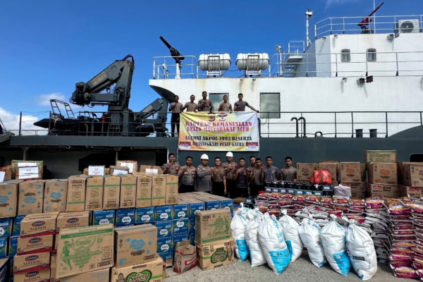 ANTARA - Kepolisian Republik Indonesia memberangkatkan kapal Wisanggeni 8005 untuk penanganan banjir di Provinsi Aceh, Rabu (3/12). Kapal tersebut berisikan logistik dan personel kepolisian dari Korps Brimob dan Sabhara. (Ibnu Zaki/Dudy Yanuwardhana/Nanien Yuniar)