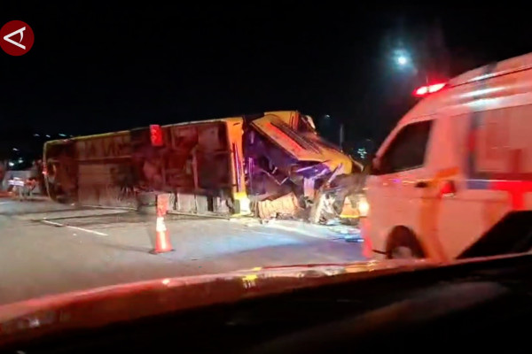 ANTARA -15 orang meninggal dunia dalam kecelakaan bus yang terjadi di ruas jalan tol Semarang, Senin (22/12) dini hari. Kecelakaan terjadi ketika bus dari Jakarta tujuan Yogyakarta tersebut melaju kencang dari arah barat ke timur dn menabrak pembatas jalan, sehingga bus terguling. (Fx. Suryo Wicaksono/Rayyan/Ardi Irawan)
