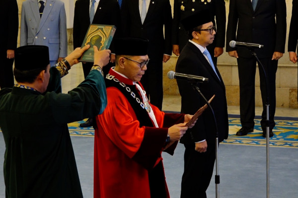 ANTARA - Adies Kadir resmi menjabat Hakim Konstitusi usai mengucap sumpah jabatan di hadapan Presiden Prabowo Subianto di Istana Negara Jakarta, Kamis (5/2). Adies sebelumnya menjabat sebagai Wakil Ketua DPR RI dan telah terlebih dahulu mengundurkan diri dari keanggotaan partai politik. (Aria Cindyara/Azhfar Muhammad Robbani/Soni Namura/Suwanti)