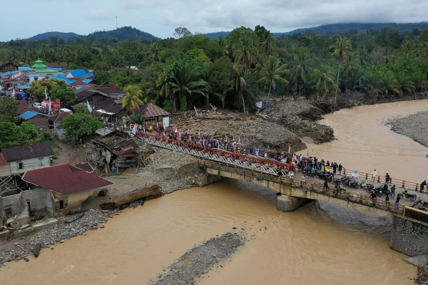 ANTARA - Petugas Gabungan dari WIKA, TNI, dan Polri, kembali melanjutkan perbaikan Jembatan Bailey Garoga 1 di Desa Garoga, Kecamatan Batang Toru, Tapanuli Selatan Sumatera Utara. Perbaikan jembatan yang menghubungkan Tapanuli Selatan dengan Tapanuli Utara menyebabkan kemacetan. Sementara kondisi cuaca menjadi tangan bagi para pekerja karena hujan lebat datang tak bisa diprediksi. (Sanya Dinda Susanti/Ibnu Zaki, Sulthony Hasanuddin/Chairul Fajri/Rinto A Navis)